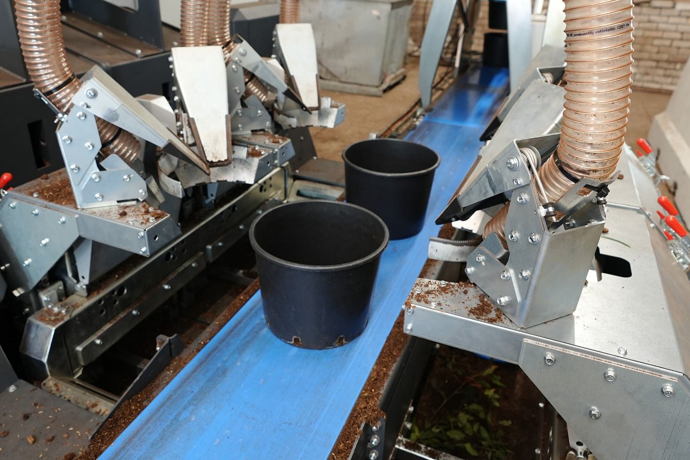 After the pre-fill, the trees are manually positioned in the pots. The machine then fills and compacts it.